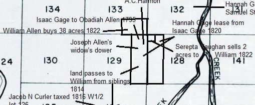 Joseph Allen is Obadiah's son, also concluded from land records. "Obadiah Allen of Dorset" purchased the east quarter of Lot 129 Ferrisburgh from Isaac Gage in 1795 (4), and above, we saw that Joseph owned a piece of Lot 129 after Obadiah's death, when he and brother Obadiah [Jr.] both received portions. These portions soon went to their brother William, who is known to be the father of Isban from William's estate records. Joseph's portion transferred after his death in 1812. |